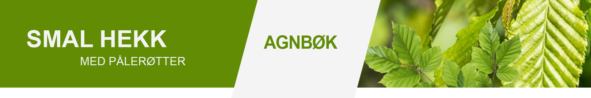 Agnbøk (Carpinus betulus) er en lettstelt, robust hekk, med tett, frodig vekst. Hekken kan klippes smalt og vokser raskere enn bøk. Hekken blir tidlig grønn på våren og beholder stort sett det brune og visne bladverket over vinteren. Den skjermer sånn sett godt både sommer og vinter. Agnbøk trives godt i sol, men tåler også noe skygge. I tillegg er den velegnet til forblåste steder. Beskjæring og stell: Hekken må klippes hvert år og gjerne i både juni og august. Legg gjerne en dryppslange for å sikre god vanning av hekken. Gjødsles vår og sommer.