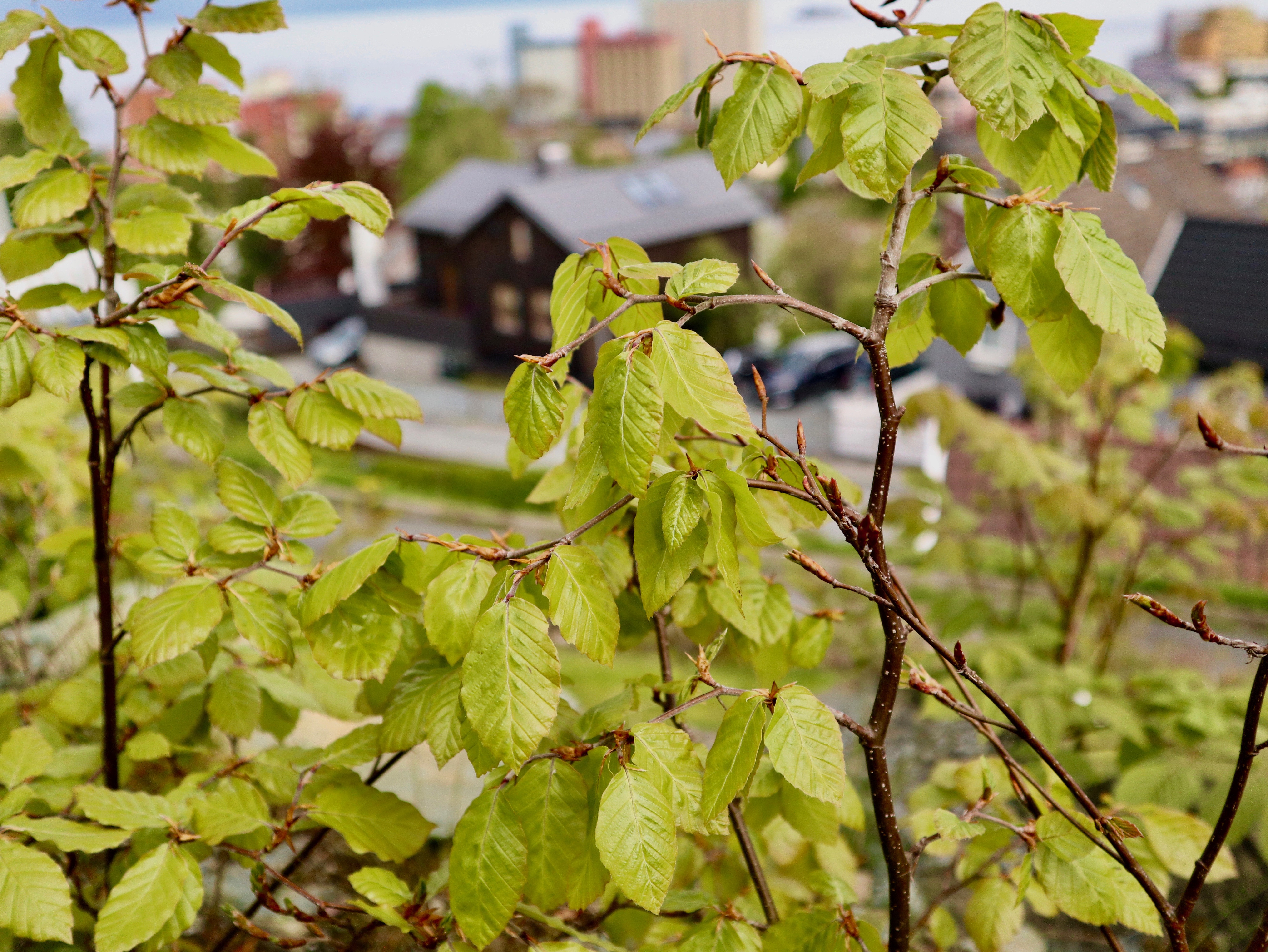 Men ett vårtegn lot ikke vente på seg: Bøkehekken fra Hekkplanter.no! Den sto i full «blomst» da vi besøkte Inge N. og hekken hans på Byåsen en hutrende junidag. Mot alle odds hadde de små kvistene, plantet i midten av juni i fjor, karret seg ut av skare og is, og sto nå ranke og stolte og så utover byen.